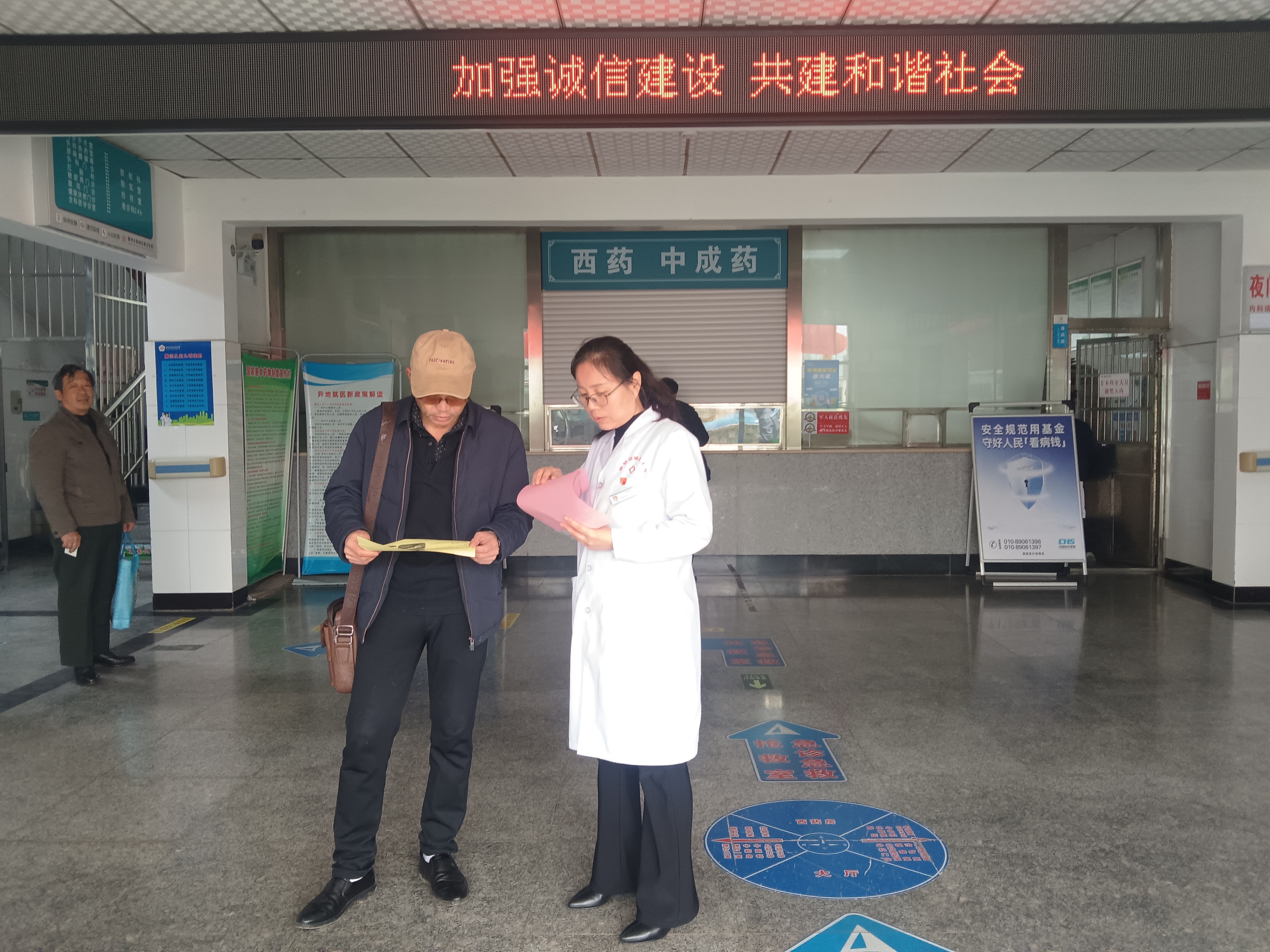 同时,在门诊大厅显著位置通过电子显示屏滚动播放诚信宣传标语,营造了浓厚的宣传氛围。医务人员化身“诚信宣传员”,穿梭在就诊人群中,向过往群众及候诊的患者家属发放信用宣传单。